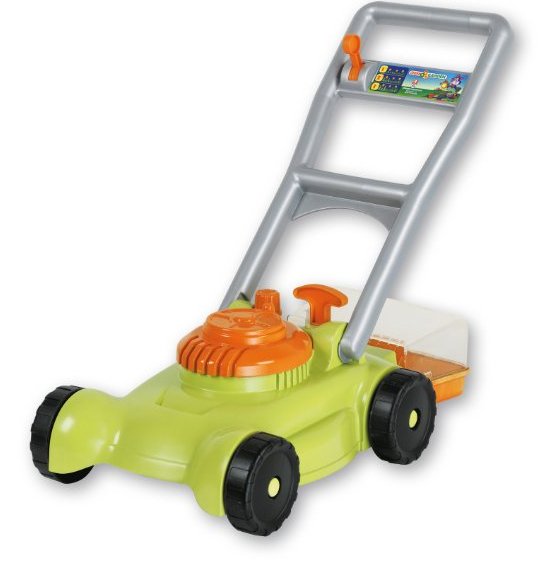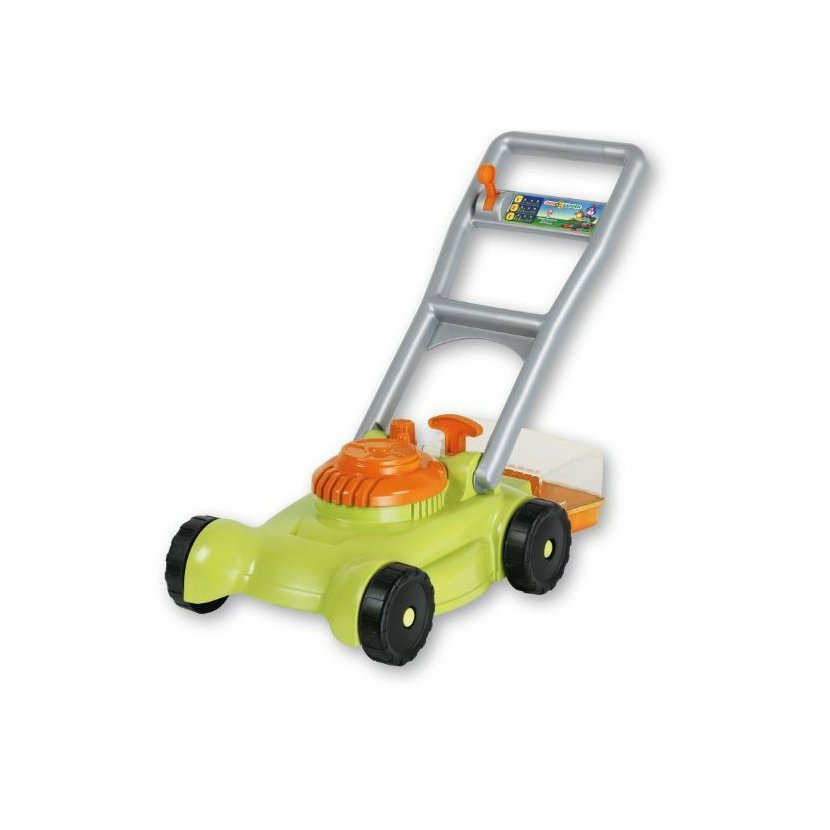 Velká plastová sekačka na trávu se sběrným košem vyrobená z kvalitních plastů v Itálii. V koši jsou malé zelené balonky simulující pohyb létající trávy při sekání.