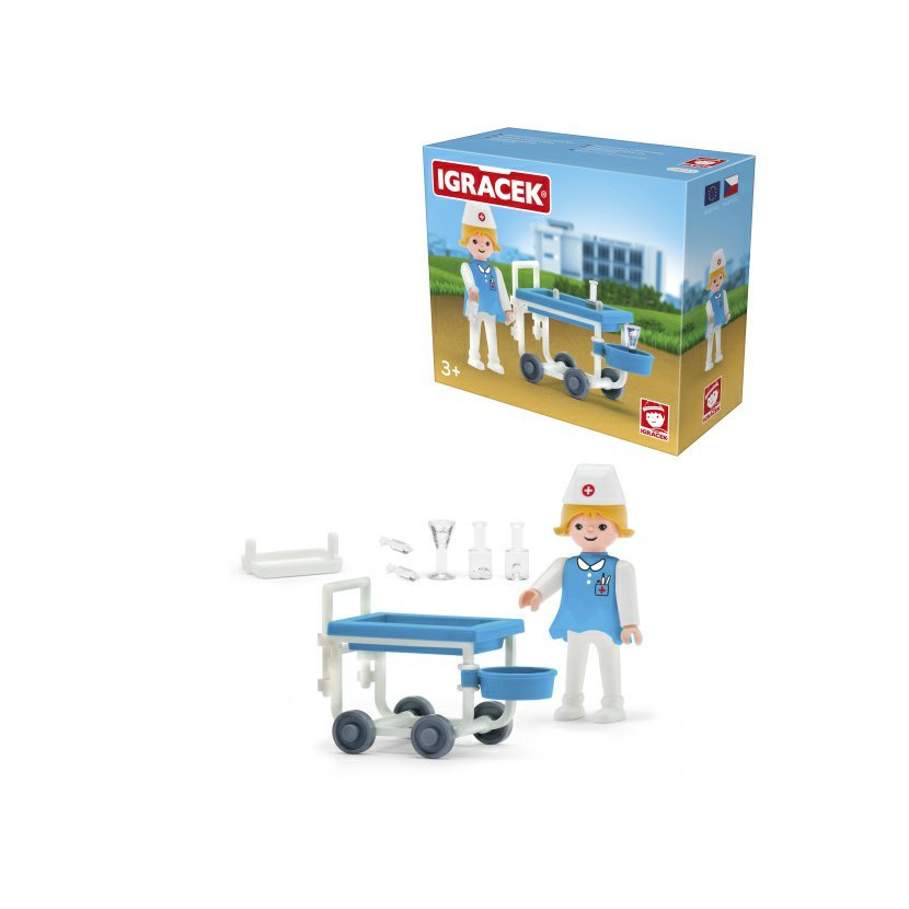 Pomáhej ostatním nemocným Igráčkům. Obětavá sestřička s vozíkem plným léků pomůže ulevit od všech možných bolístek. Legendární postavička od roku 1976. Vyrobeno v ČR. Velikost figurky 75mm.