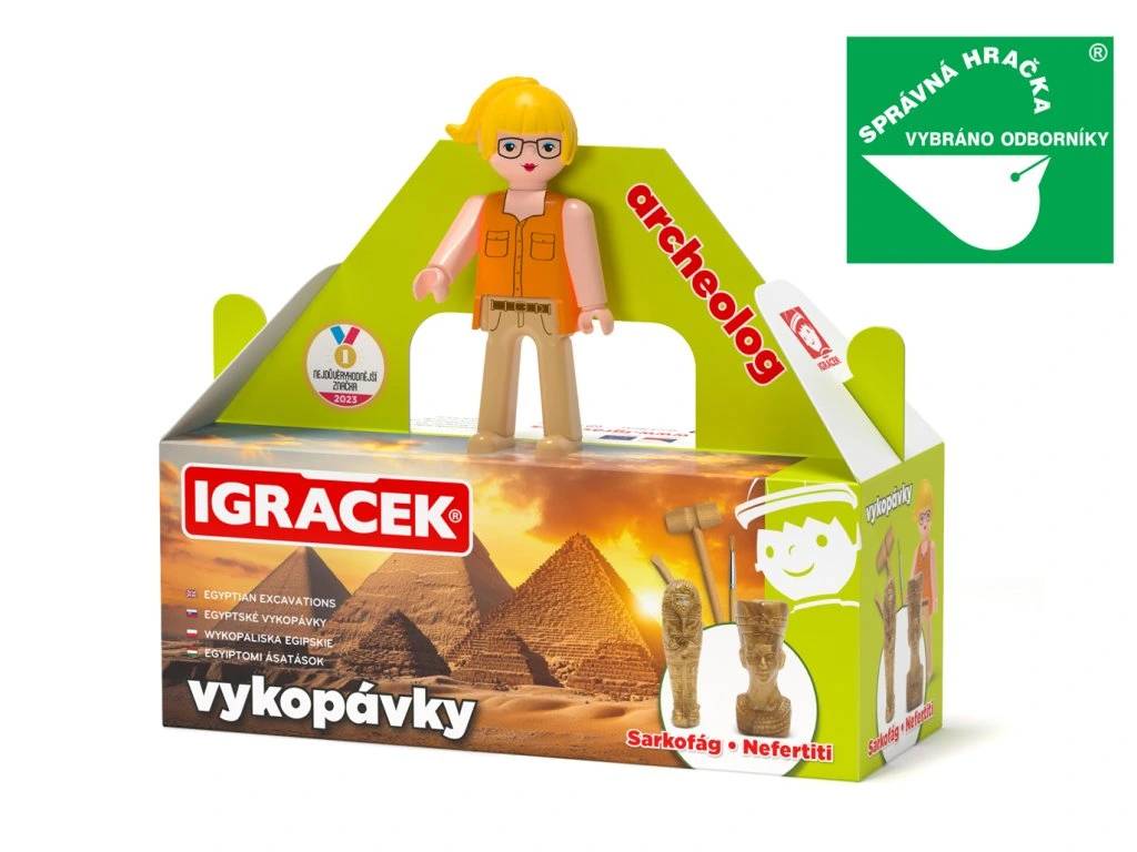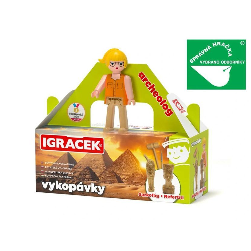 Děti rády objevují. Proto jsme pro ně připravili dobrodružnou řadu Igráčků s vykopávkami. V tomto setu budou děti s Igráčkem Archeoložkou odhalovat egyptské artefakty. Jejich úkolem bude vykopat ze dvou kamenů sarkofág a sošku Nefertiti. Při zábavné činnosti si procvičí jemnou motoriku i trpělivost.