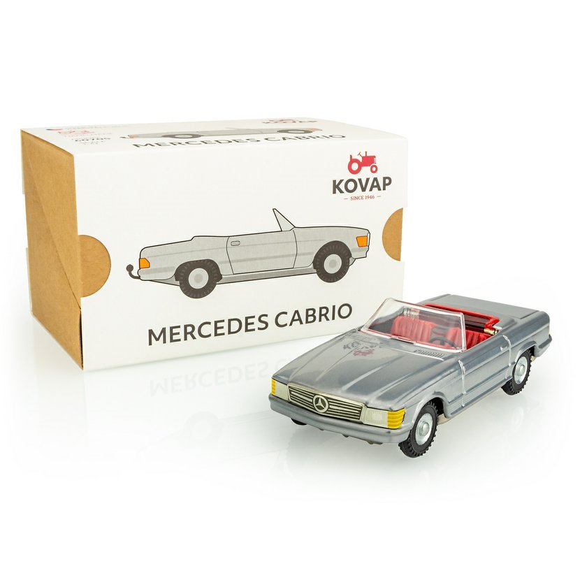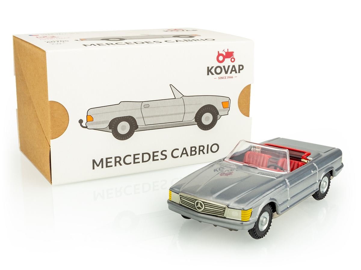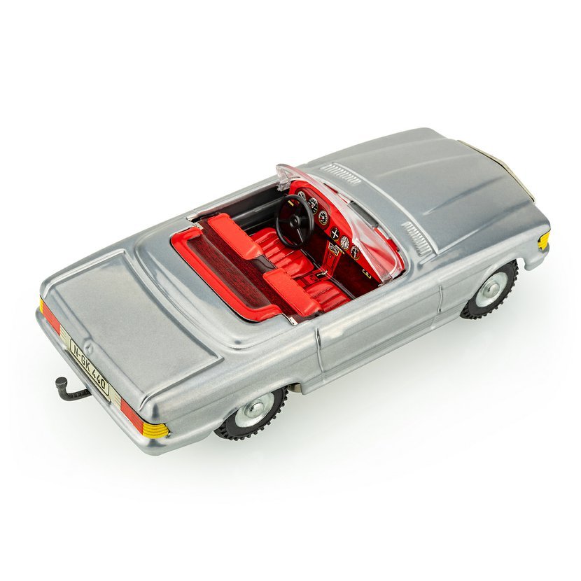 Model automobilu Mercedes Benz 350 SL z roku 1971 je vyroben z potištěného plechu upraveného práškovou barvou.