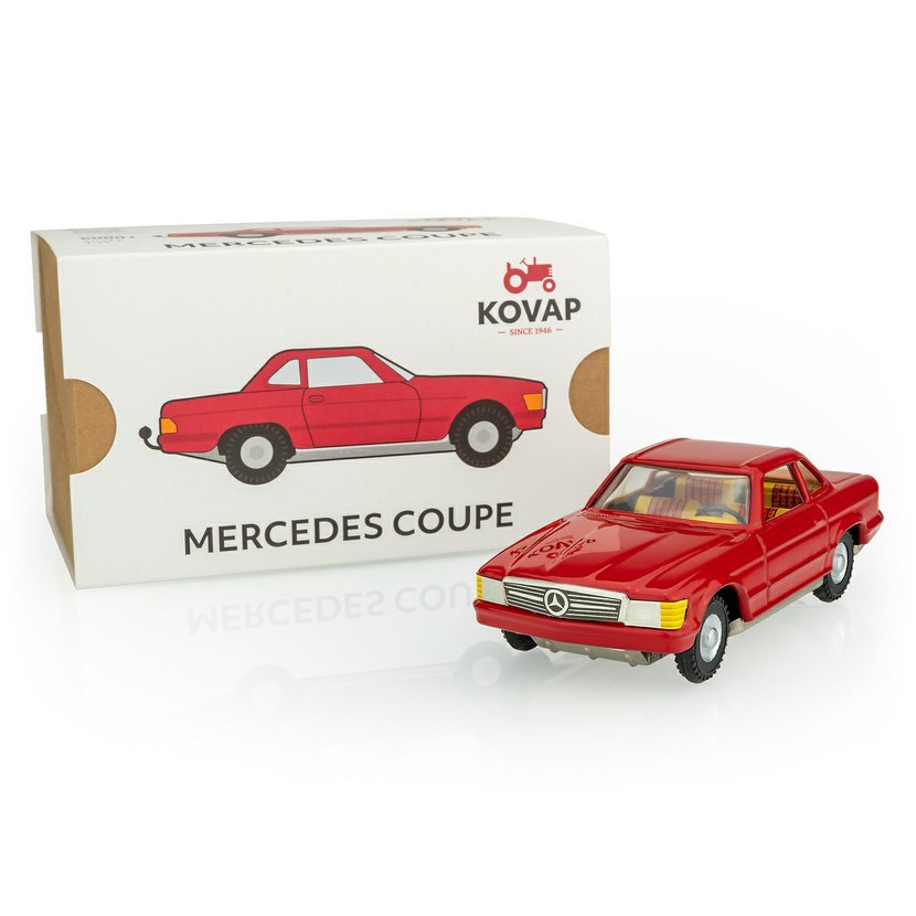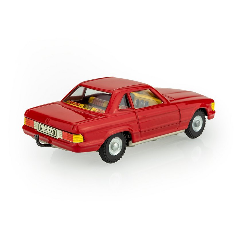 Model automobilu Mercedes Benz 350 SL z roku 1971 je vyroben z potištěného plechu upraveného práškovou barvou.