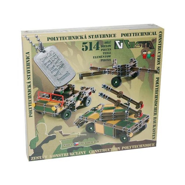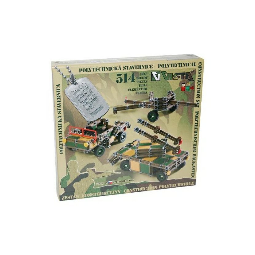Stavebnice Seva ARMY 1 obsahuje 514 dílků, ze kterých si můžete sestavit vojenskou techniku např.: dělo vlečené džípem, či vozidlo protivzdušné obrany.... Stavebnice obsahuje návod na řiditelnou nápravu a velké měké pneumatiky.