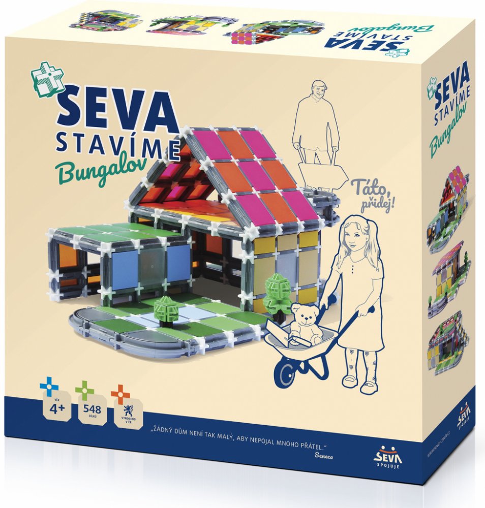 Stavebnice SEVA STAVÍME – Bungalov se skvěle hodí na stavbu nejrůznějších malých i velkých domečků. Postavíte si klasický domek s terasou, nízký bungalov s velkými dveřmi nebo chatičku se zahrádkou. A další stavby jaké vás napadnou, podle své fantazie. Šedá barva nahradila klasickou modrou a zahnuté spojovací dílky umožňující zakulacené obrysy umožňují naprosto perfektní výsledek i z takové jednoduché stavebnice, jako je Seva. Stavebnice obsahuje podrobný návod na sestavení tří bungalovů.