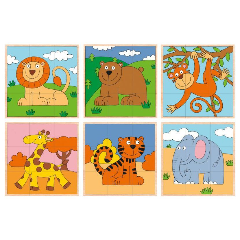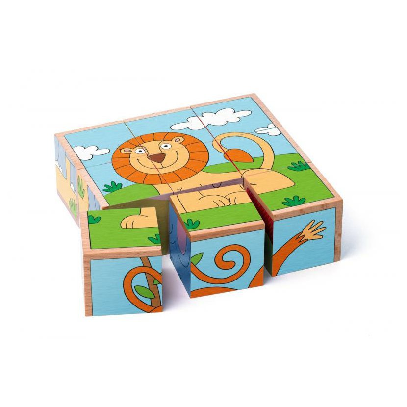 Poskládejte si zvířátka z džungle. Sestavením kostiček Vám může vznikout obrázek lva, žirafy, slona, medvěda, tygra, nebo opičky. Kostičky můžete využít nejen ke skládání obrázků, ale i pro stavění komínů, ohrádek apod. Tato hračka podporuje rozvoj motoriky, manuální zručnost a fantazii. Kostky jsou vyrobeny z velice kvalitního dřeva. Balení obsahuje celkem 9 kostiček. Parametry: materiál: dřevo rozměry složeného obrázku: 13,5 x 13,5 cm Vhodné pro děti od 1 roku.